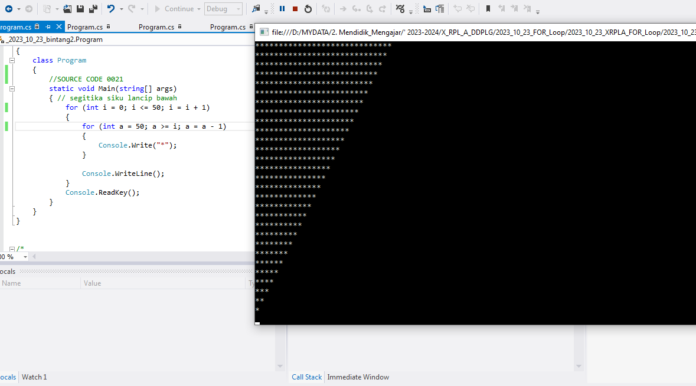 - Menampilkan barisan karakter * membentuk segitiga siku lancip bawah
