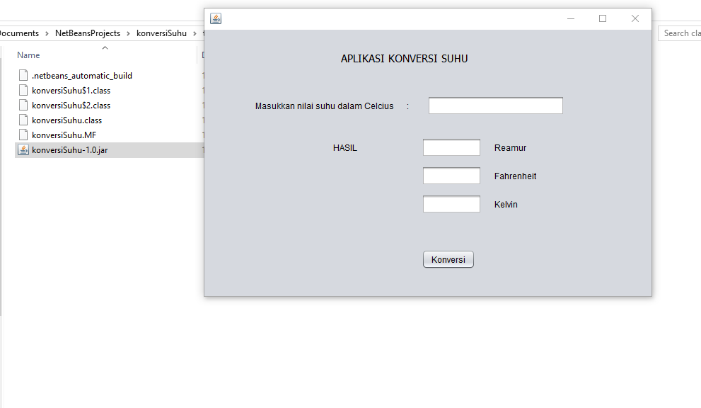 Sebenarnya hanya berangkat dari penasaran saja. Ketika membuat project di Visual Studio dan di-compile maka file execute (exe) otomatis akan terbentuk. File ini bisa dijalankan meski dipindahkan ke folder lain. Nah, apakah ini berlaku untuk project JAVA pada NetBeans ? Secara logika, mestinya sama. Akhirnya, untuk pembuktian, saya cari contoh code JAVA berbasis window dengan studi kasus konversi suhu.