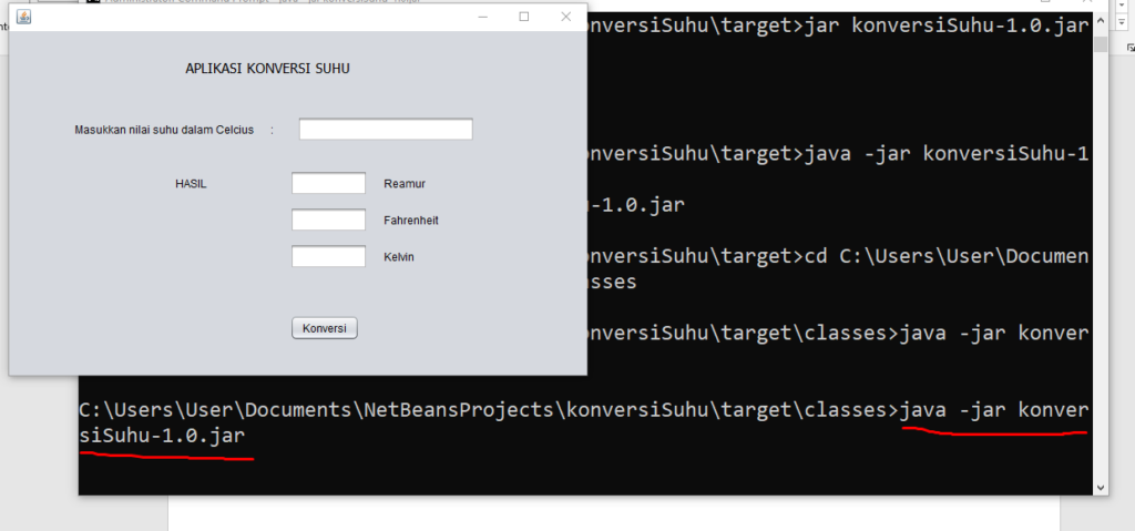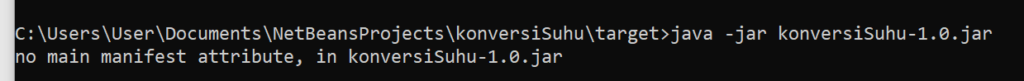 Perintah : java -jar konversiSuhu-1.0.jar Output yang muncul : no main manifest attribute, in konversiSuhu-1.0.jar
