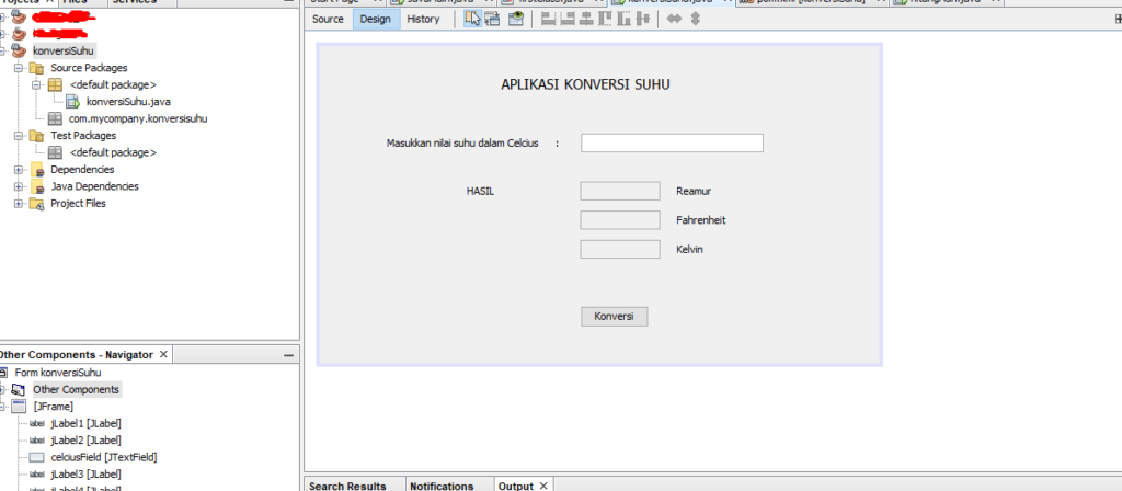 Selanjutnya, pada project kita, klik kanan lalu pilih “New” -> “JFrame From …” dan namai dengan nama yang sesuai, misal “konversiSuhu”. Akan tampil draft form yang bisa kita isi dengan komponen-komponen interface. Pasangkan komponen form sebagaimana gambar di bawah ini.