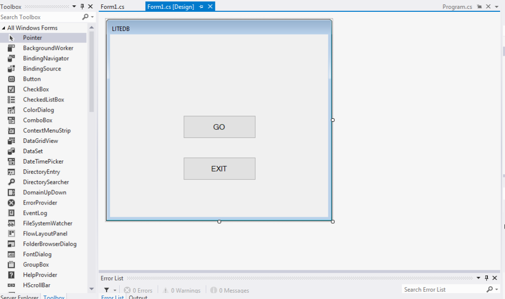 Selanjutnya, di sini kita juga mencoba bagaimana implementasi sederhana dari LiteDB ini. Langkahnya, kita membuat sebuah project berbasis WinForm di Ms. Visual Studio (uji coba ini menggunakan Ms. Visual Studio 2012), lalu pada form yang tampil, kita menambahkan dua button dengan masing-masing teksnya “Go” dan “Exit”. Button “Go” untuk mengeksekusi code uji coba LiteDB, sedangkan button “Exit” untuk keluar aplikasi.