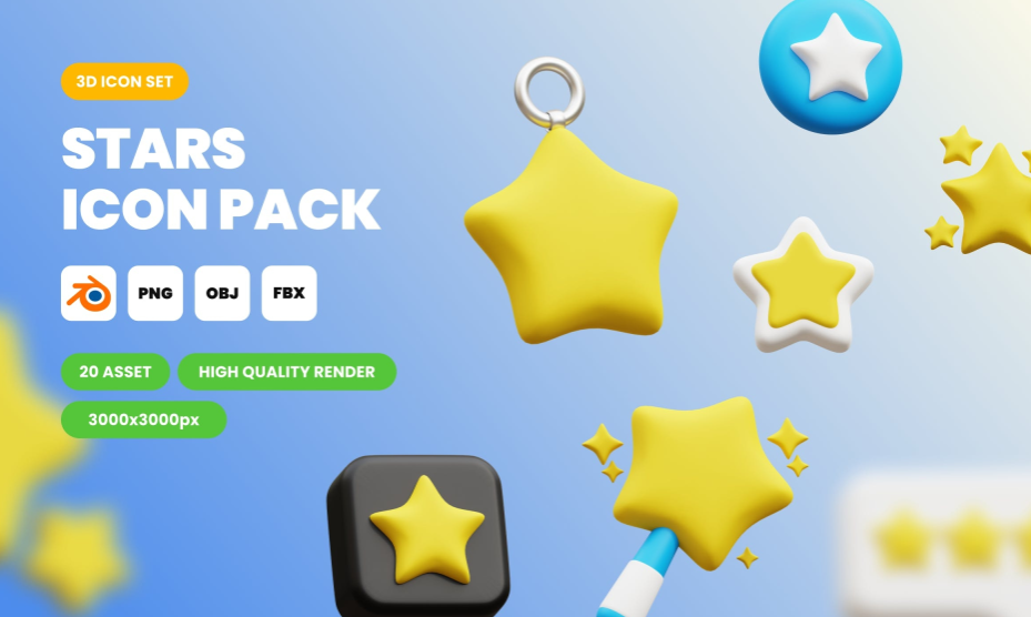 pakah Anda menghendaki sentuhan kosmis pada proyek, presentasi, atau karya kreatif Anda? Maka, jangan lewatkan sentuhan desain Anda dengan 3D Stars Icon Pack. Dengan 20 aset 3D yang unik, berkas .PNG, .BLEND, .OBJ, dan .FBX, serta gambar PNG beresolusi tinggi (3000 x 3000 px), ikon-ikon ini siap untuk menambahkan nuansa keajaiban kosmik pada desain Anda.